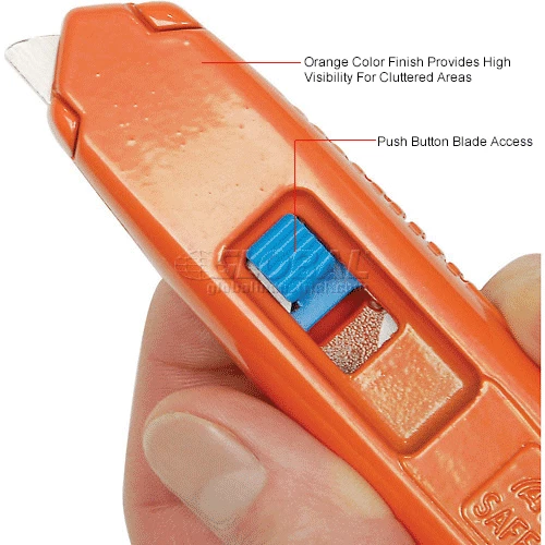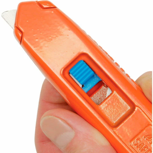Reduces accidents, down time and compensation rates. Rounded point blades reduce the possibility of puncture injuries. Safety spring slider pulls the blade into the knife body automatically. Minimum blade exposure of only 3/8″. Left/right operation. One button EZ opening – no screwdriver needed. Includes 6 blades. Sold 12 knives per box.