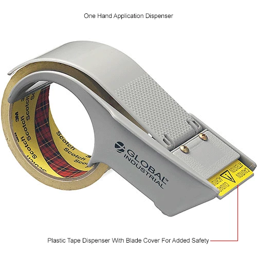 Improve your shipping process with the Global Industrial™ Clamshell Tape Dispenser. This plastic tape dispenser includes a blade cover for added safety and is ideal for operational needs in work environments such as warehouses, shipping, and distribution centers. 1 Year Limited Warranty.