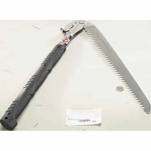 Two-handed, professional, heavy-duty folding saw with a 19-4/5 inch blade. Can easily compete with a chainsaw Compared with the Katana, the legendary Japanese samurai sword, it is the largest folding saw on the market today. The long, well-balanced, taper-ground blade with an impulse-hardened, non-set tooth design provides extended working reach, faster cutting and handles large limbs and trunks with no effort. The non-slip, two-handed, rubberized cushioned handle provides a sure and comfortable grip even in the most difficult operating conditions. Suitable for serious tasks like cutting large timber and tree trunks. Exceptional design, strength, balance and superior finish quality. Comes with a sturdy nylon shoulder bay with touch fasteners fastening and a pocket for replacement blades. Made in Japan.
