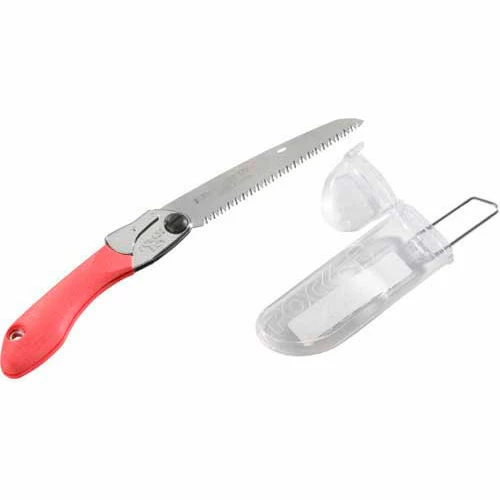 Compact lightweight folding saw with 5-inch blade that will take up very little room in your pocket or backpack. Nicknamed as “Little Giant” due to its extraordinary cutting capacity. This sleek saw features rust-resistant, hard chrome-plated, taper-ground blade with an impulse-hardened non-set tooth design for greater cutting efficiency. Utilizes proprietary Silky MIRAI-ME (Smooth Cutting) Technology The Teeth of the Future! The precision-ground, razor sharp blade provide fast, clean and smooth cutting. The blade locks securely into one of two open positions, in line with the handle and flush cutting. The blade resists the effects of tree resin and easily wipes clean. The non-slip rubberized handle provides a sure and comfortable grip even in the most difficult operating conditions. Exceptional design, strength, balance and superior finish quality. Clear plastic flip-lock carrying case with belt clip is included. An ideal saw for your glove box or to carry on hikes. Made in Japan. POCKETBOY is available in two blade lengths: 5-inch (130 mm) and 6-3/4-inch (170 mm). The blades are interchangeable within the same blade length. Every blade length is available in four teeth sizes/configurations (tpi teeth per inch): 7 tpi Large/Coarse (pruning, green wood), 8.5 tpi Medium (soft wood), 17 tpi Fine (hard wood, bamboo), and 22 tpi Extra Fine (dry hard wood). Each POCKETBOY has a color-coded handle associated with the teeth configuration: Red Large teeth, Black Medium teeth, Yellow Fine teeth, and Purple Extra Fine teeth.