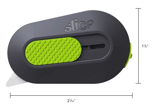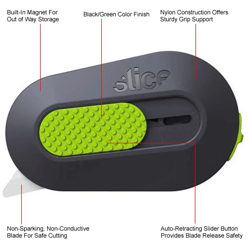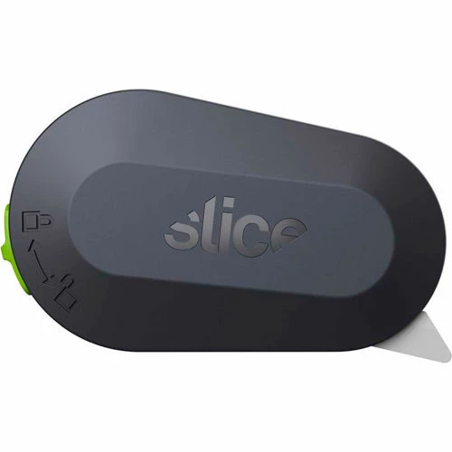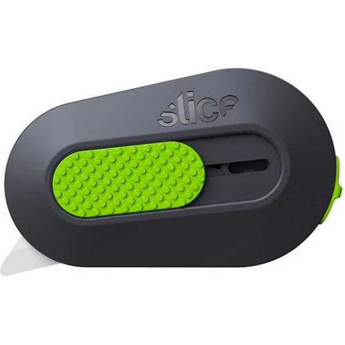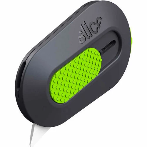 The 10514 is Slice’s auto-retractable version of the popular Mini Cutter. This versatile tool works as a box cutter, handy knife, or kitchen multi-tool. The safety blade stays out of harm’s way when the knife’s not in use and keeps you safer when it is in use, thanks to the Slice® proprietary blade manufacturing process. All Slice® blades are safe to the touch and strong enough to cut effectively, and last up to 11 times longer than metal blades. Blades are also chemically inert, have no oil coating, and never rust. This cutter features an onboard magnet to keep it handy, and two different blades slots so it can be adjusted for right- or left-handed use. Ships with rounded-tip blade and compatible with pointed-tip blade, both Finger-friendly®.