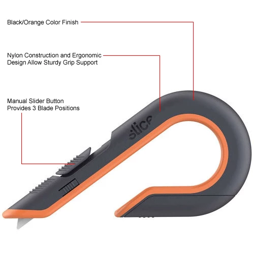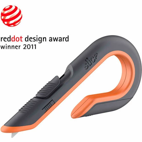 The Slice® Box Cutter revolutionized safety with its ceramic safety blade and unique handle. Slice’s safer ergo handle wraps around your hand, protecting you from staples while providing the perfect angle to expose only as much blade as you need. Used by more than half the Fortune 1000, the Finger-friendly® blade lasts up to 11 times longer than steel and doesn’t require a sharps disposal box. Suitable for single and double-walled corrugated.