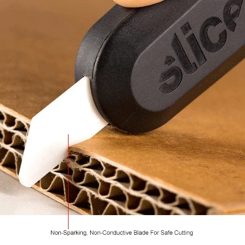 The Slice® 10550 Manual Utility Knife is one of three handle styles available. It offers five blade positions, allowing the user to choose the correct blade depth for the job. Slice’s proprietary manufacturing process creates a Finger-friendly® ceramic blade edge. The manual safety utility knife features a durable glass-filled nylon handle and long-lasting replaceable blades. Slice® ceramic blades are non-sparking, non-magnetic, and chemically inert. They never rust and are safe up to 1600 degrees Celsius.