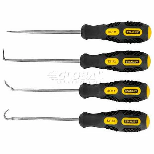 Stanley® 82-115, 4 Piece Pick & Hook Set Handle with textured rubber grip for comfort and to provide a slip-resistant grip. Plated bars for corrosion resistance. Versatile set for a wide range of applications. INCLUDES:(1) 6 in (152 mm) Straight Pick (1) 6 in (152 mm) 90° Hook (1) 6 in (152 mm) Full Hook (1) 6 in (152 mm) Angle Hook