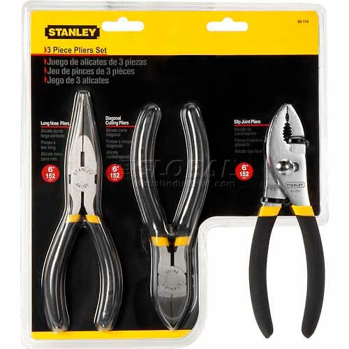 For a firm grip on material that needs bending or cutting, the Stanley® 84-114, 3 Piece Basic Plier Set comes with three distinct plier tools to handle pipe rods, wires, and more. Each handle features an oil-resistant coat that allows for a comfortable grip while under a tight holding position. Although compact and lightweight these tools are made of drop-forged steel for high level strength and durability. Meets ANSI specifications. Drop-forged steel is strong and durable Pliers set designed for grasping, bending and cutting Meets ANSI specifications Includes: 6″ Slip Joint, 6″ Diagonal, 6″ Long Nose pliers