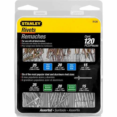 Stanleyยฎ R120, Rivet Pack Assortment, 120 Pack Assorted pack contains 120 aluminum and steel rivets in the most popular sizes. Reusable, full-visibility packaging simplifies product selection and storage. Includes:(25) 1/8 x 1/8 in Steel Rivets, (20) 1/8 x 1/4 in Steel Rivets, (15) 1/8 x 3/8 in Steel Rivets, (25) 1/8 x 1/8 in Aluminum Rivets, (20) 1/8 x 1/4 in Aluminum Rivets, (15) 1/8 x 3/8 in Aluminum Rivets For use with: MR33C, MR55C5, MR77C