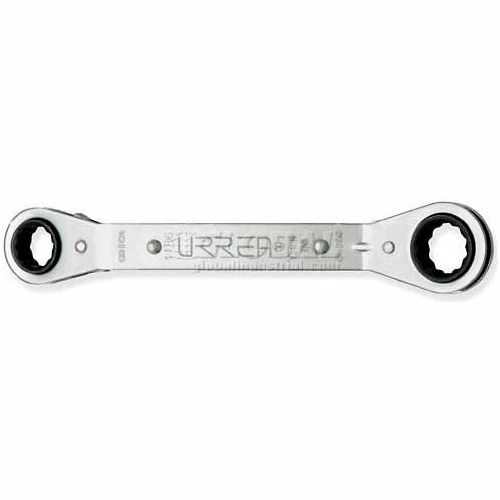 Ratcheting mechanism allows you to reposition the wrench without having to unhitch it from the nut or bolt. Thin body formed by two exterior plates and a solid interior body. Full polished with nickelchrome finish prevents corrosion. 15° offset.
